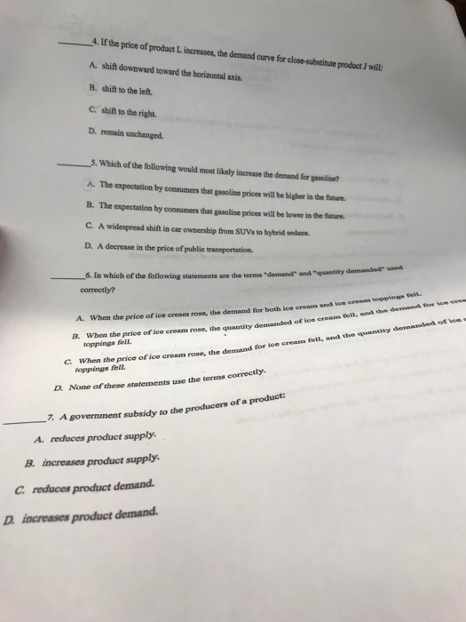 Solved 4 If The Price Of Product L Increases The Demand